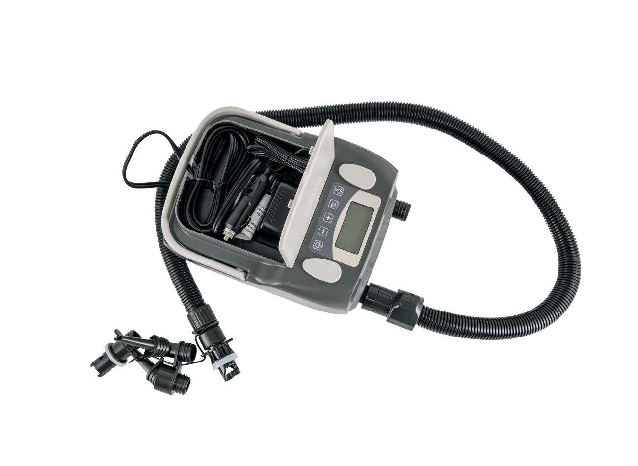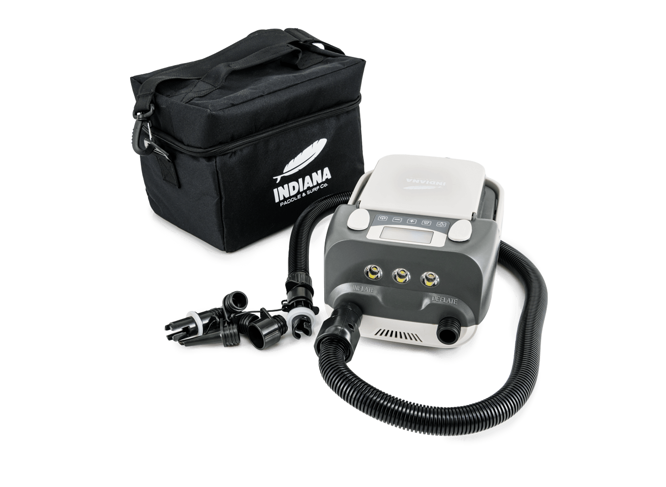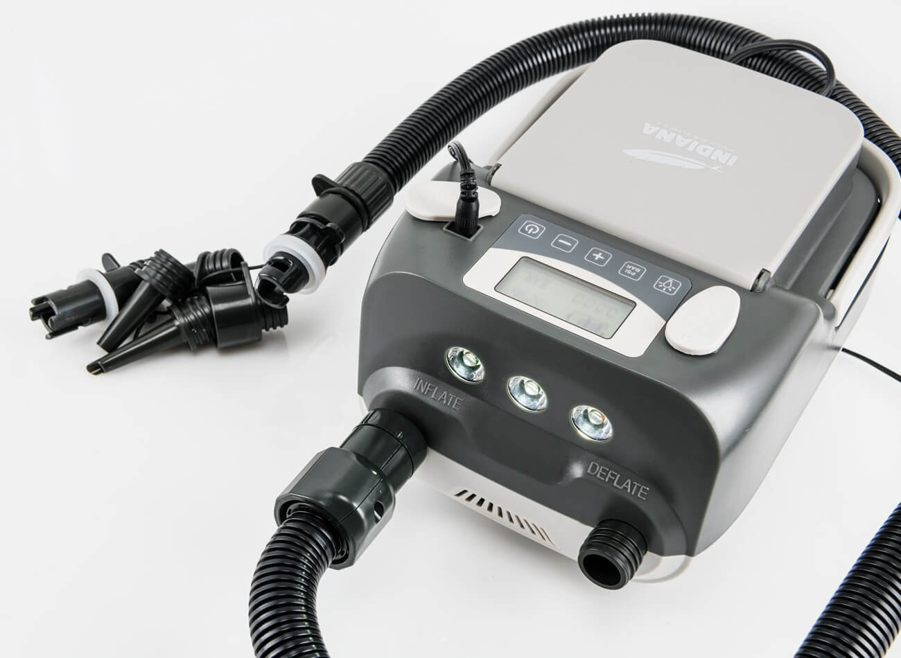 Die INDIANA BATTERY PUMP HT-790 hat eine integrierte Stoppfunktion und schaltet sich beim Erreichen des Sollwerts automatisch aus.. Die eingebaute, hocheffiziente Lithiumbatterie mit Echtzeitanzeige im Akku, ist mit einer doppelten USB-Steckdose ausgestattet und bietet verschiedene Lademöglichkeiten. Der widerstandsfähige Nylonschlauch dieser Akku Pumpe hat durch verschiedene Adaptern ermöglicht eine Vielzahl an Einsatzmöglichkeiten. Die Pumpe erlaubt eine schnelles und einfaches Umstellen der Druckeinheit und pumpt bis zu 16 PSI. Dank dem ergonomischer Klappgriff lässt sich sie sich zudem bequem transportieren.